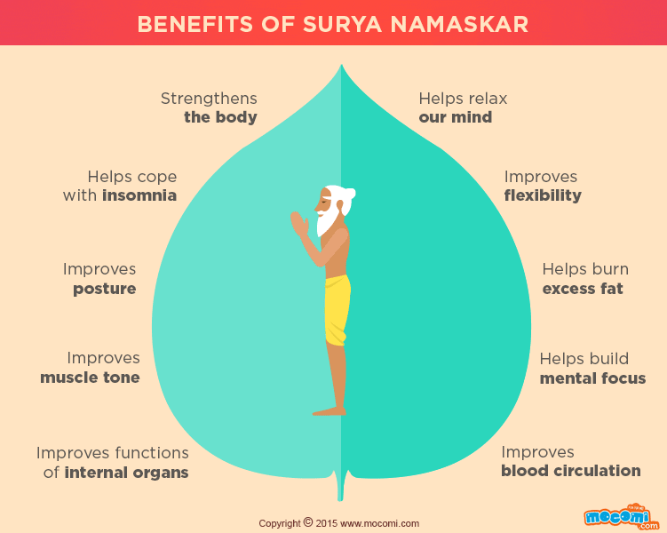 Surya Namaskar (Sun Salutations) - Taking your time in each pose, or moving through a flow using your breath to guide the movements, Sun Salutations are a great way to quiet your mind and focus on being present in the moment. Sequence: